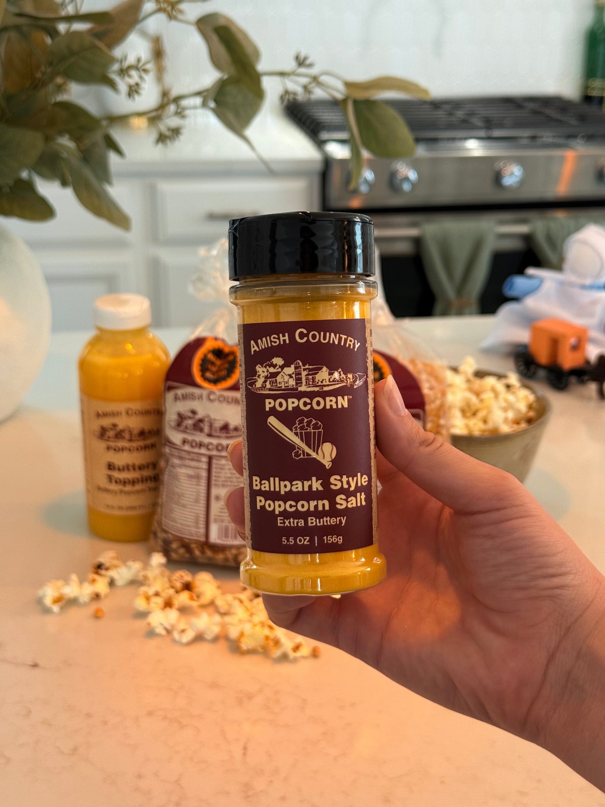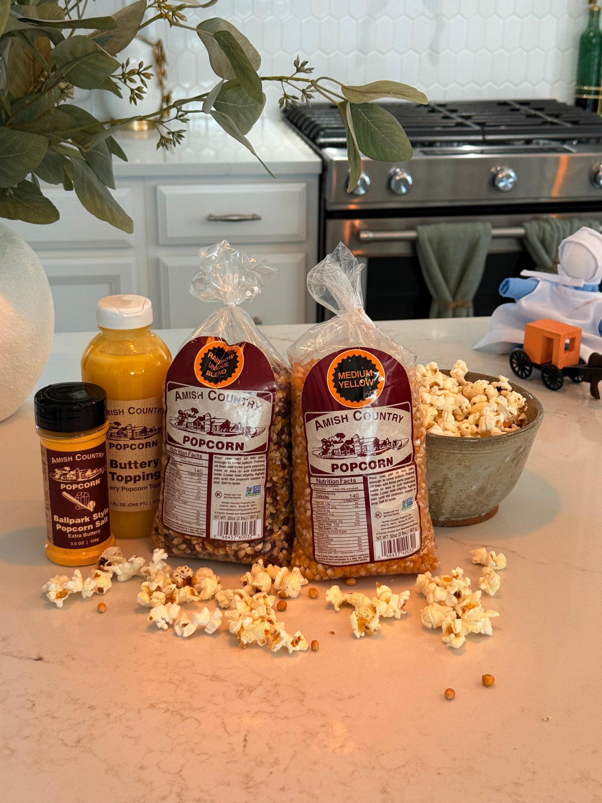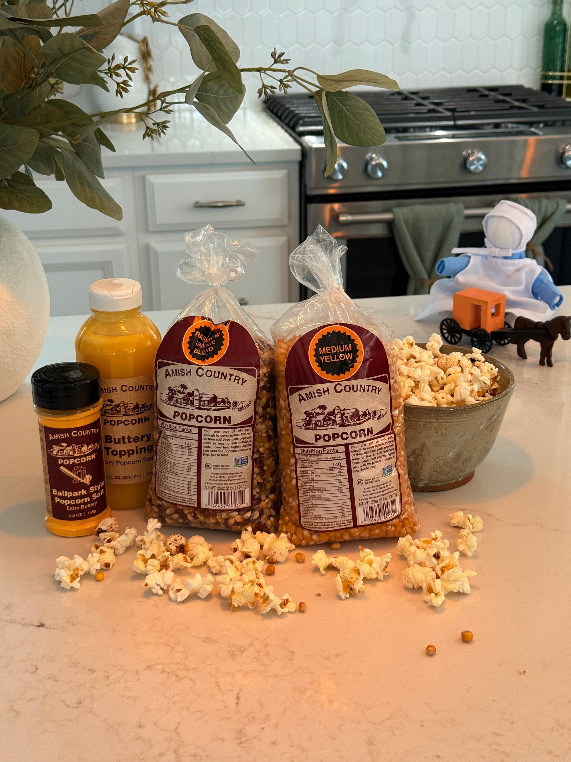 Our Amish Country Popcorn gift set includes one 2 lb bag of white hulless popcorn, one 2 lb bag of rainbow popcorn, one 16 oz jar of butter popcorn topping and one jar of Amish Country Ballpark Popcorn salt!