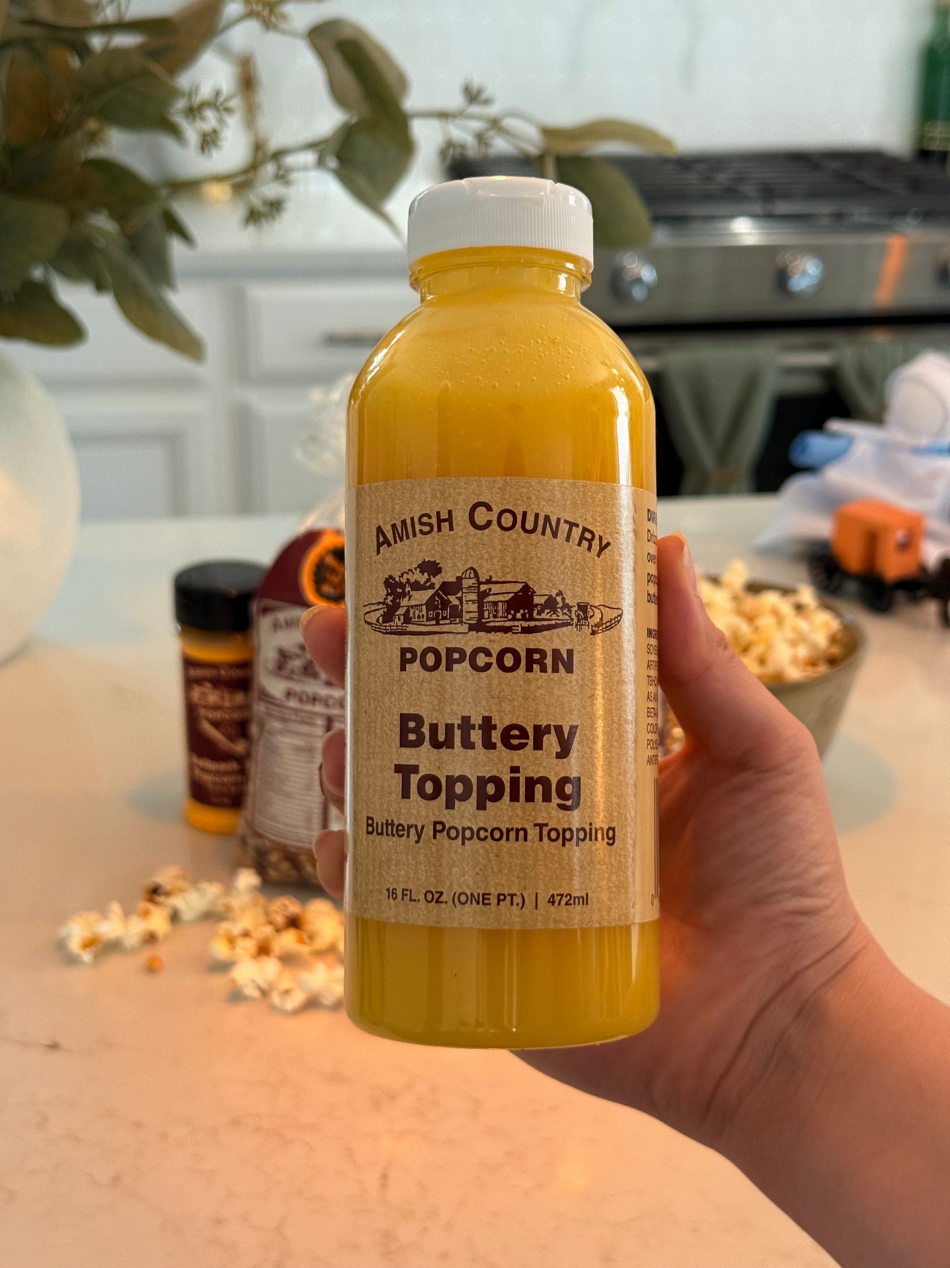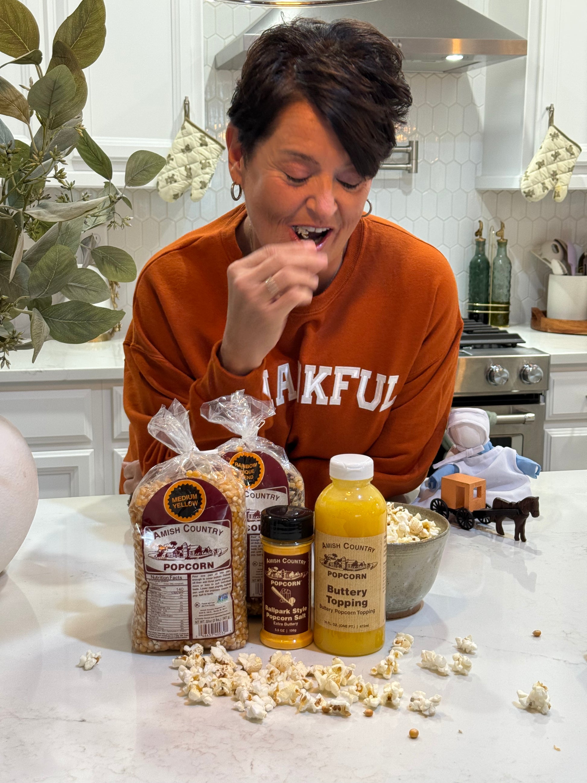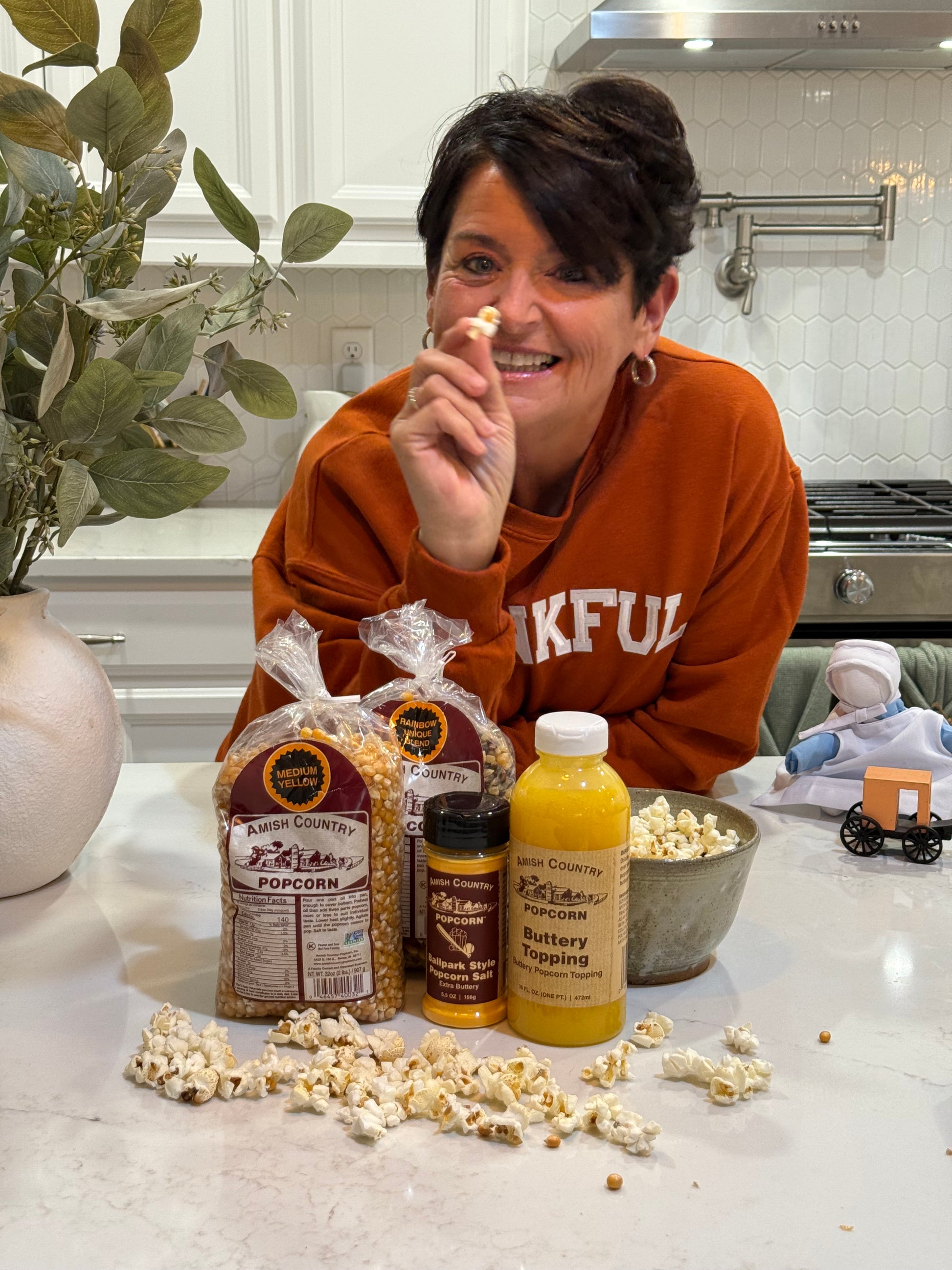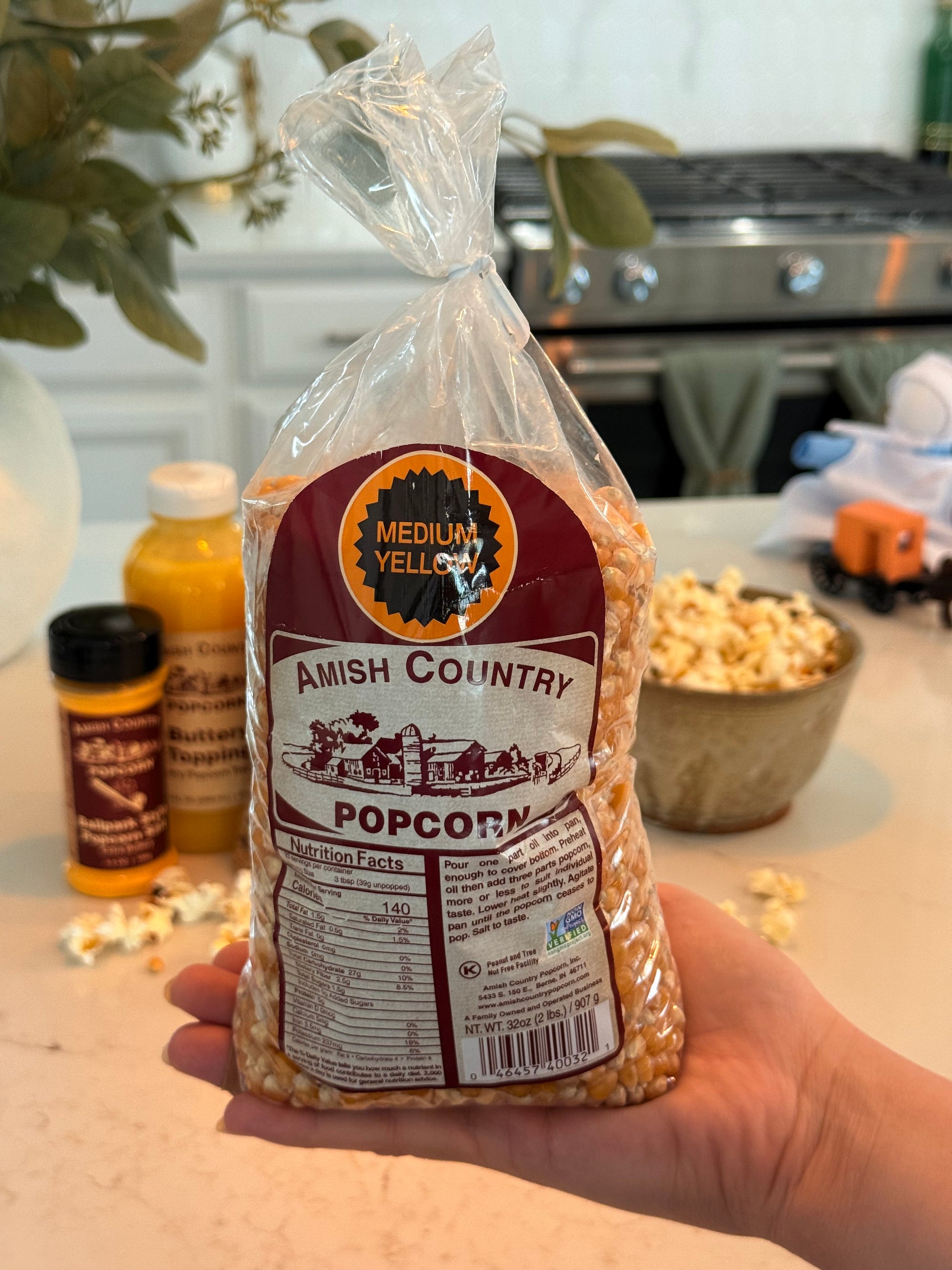 Our Amish Country Popcorn gift set includes one 2 lb bag of white hulless popcorn, one 2 lb bag of rainbow popcorn, one 16 oz jar of butter popcorn topping and one jar of Amish Country Ballpark Popcorn salt!