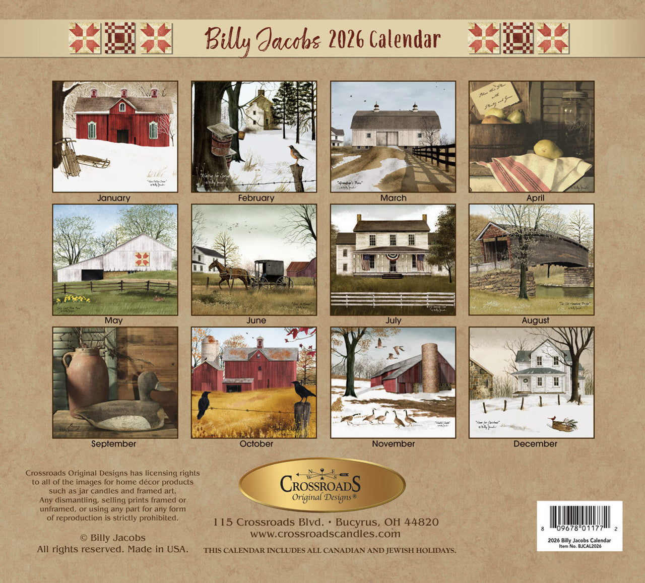 Bring simple-country charm to every month of the new year with the Billy Jacobs 2026 Wall Calendar. Featuring twelve timeless scenes—weathered barns, cozy farmhouses, quiet country lanes, and changing seasons—this calendar adds a warm, rustic touch to your kitchen, office, or entryway.