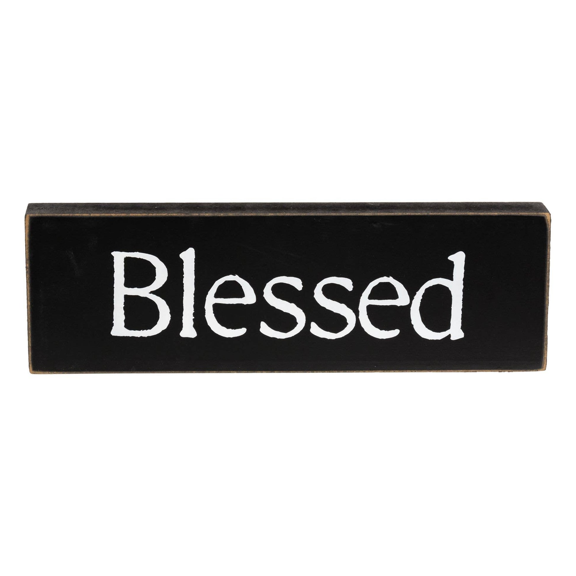 The Blessed Typewriter Block is a decorative wooden block finished with black paint and worn edges, reading “Blessed” in white lettering. This block is a simple, everyday addition to home décor and can be displayed freestanding on a bookshelf, riser, tiered tray, or other tabletop surface. Measures 3” high by 9.5” wide by 1” deep.