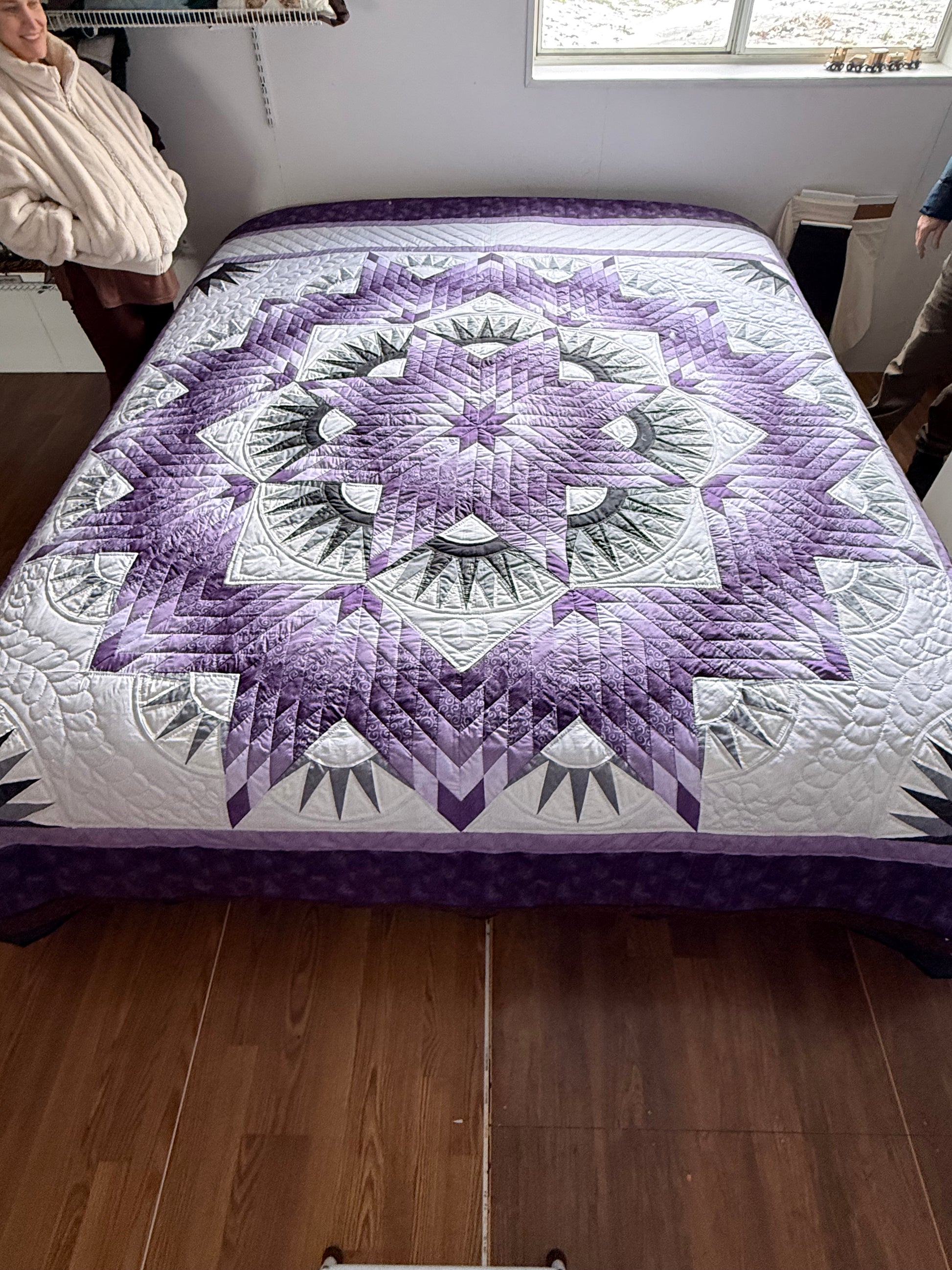 Radiating from the center, the striking Mariner’s Star design features layers of soft lavender, deep purple, silver gray, and crisp ivory fabrics arranged in intricate geometric symmetry. The detailed quilting enhances the movement of the star pattern, creating depth, texture, and a sense of peaceful balance.