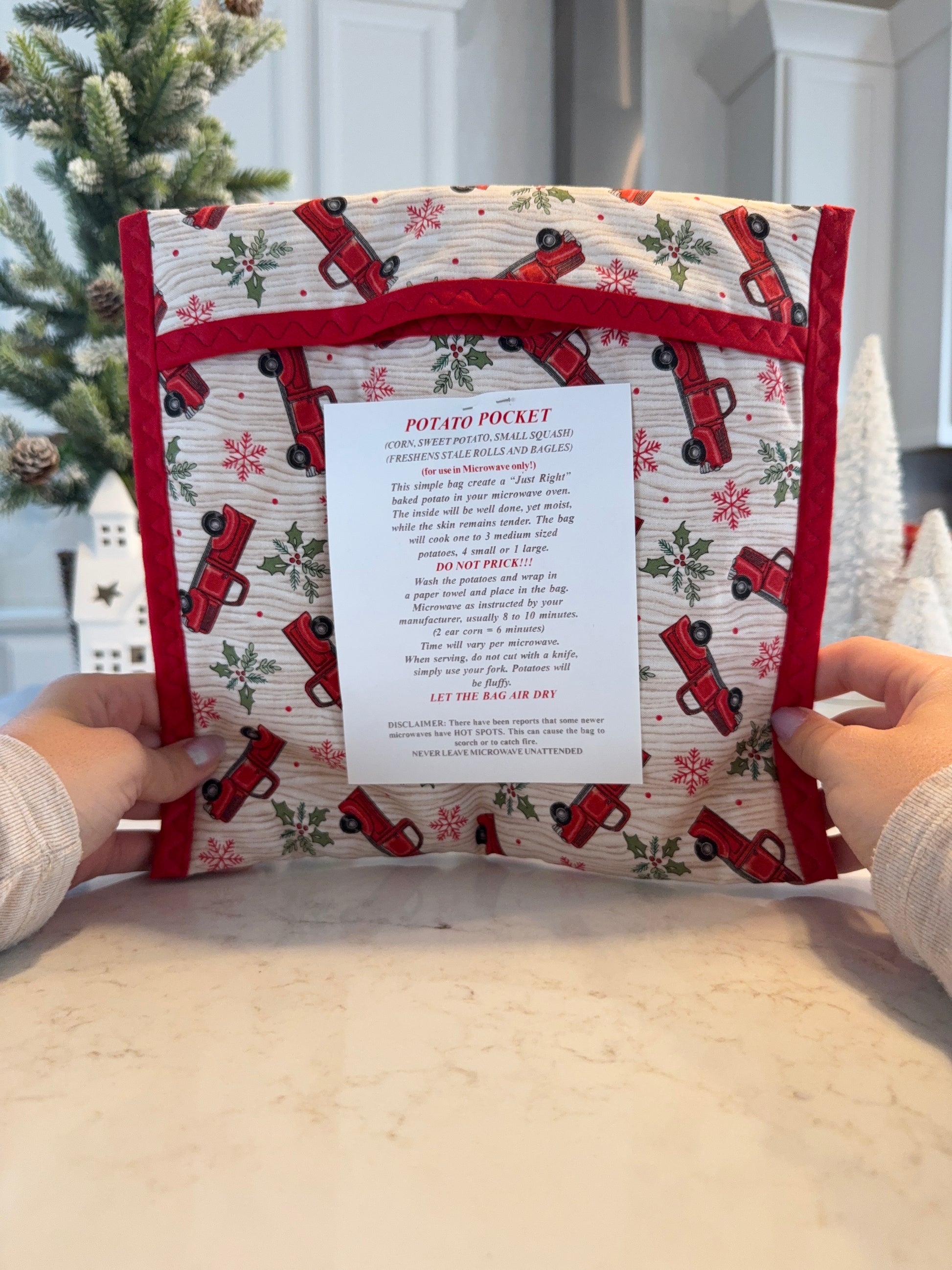 Our Amish-Made Potato Pocket is a clever and cozy kitchen essential handmade right here in Amish Country. Each one is sewn with 100% cotton materials and made to perfectly cook soft, fluffy potatoes right in your microwave—no foil or mess needed!