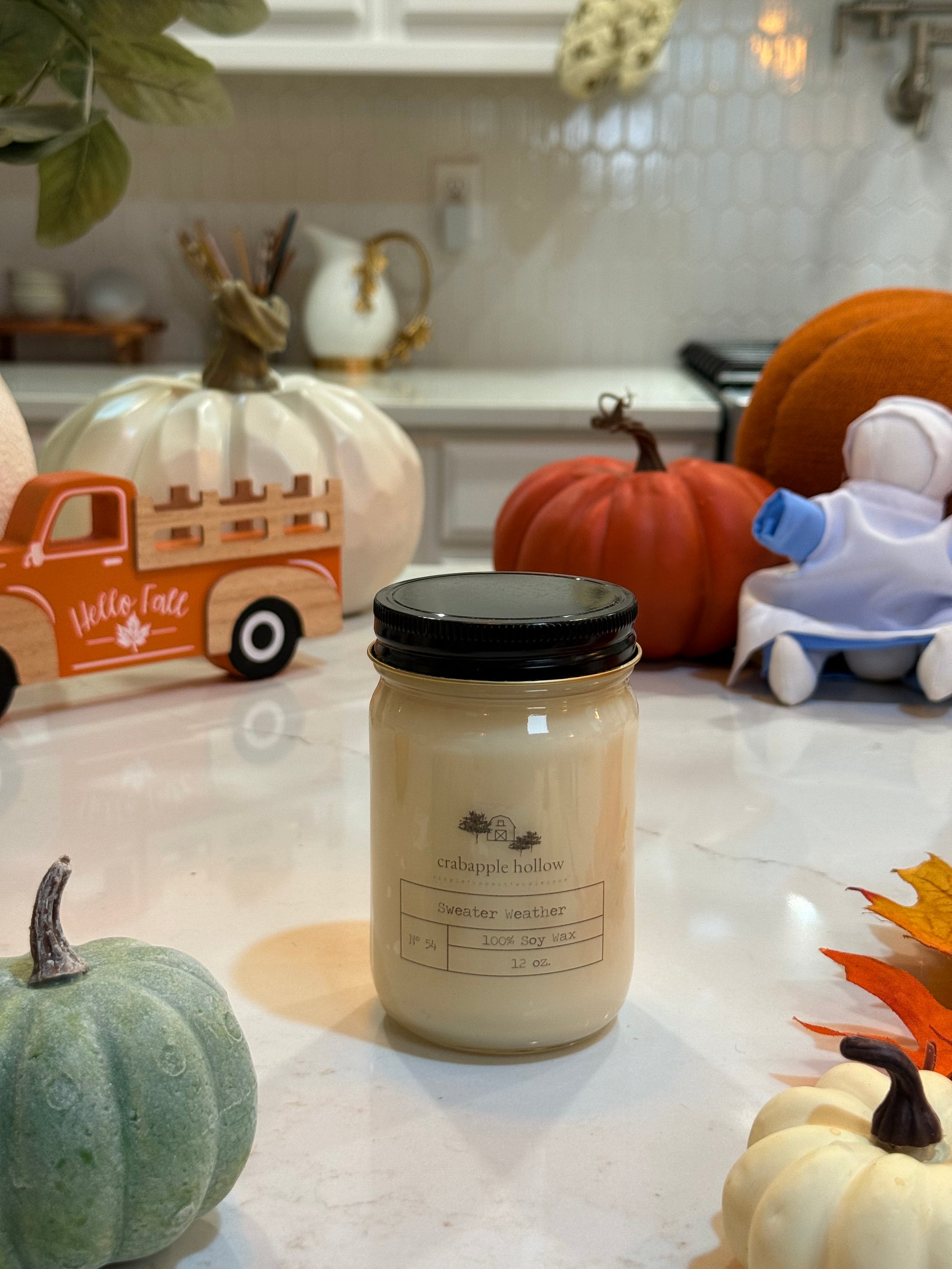 Sweather Weather is a part of the Crabapple Hollow Signature Fall Candle Collection. Just as the name eludes, this scent will entice you to want to break out the cardigans and the crewnecks! Sweater Weather brings both the comforting vibes you want when the leaves start to change and an intriguing, fresh element that reminds us of the chilly air on a Fall evening.