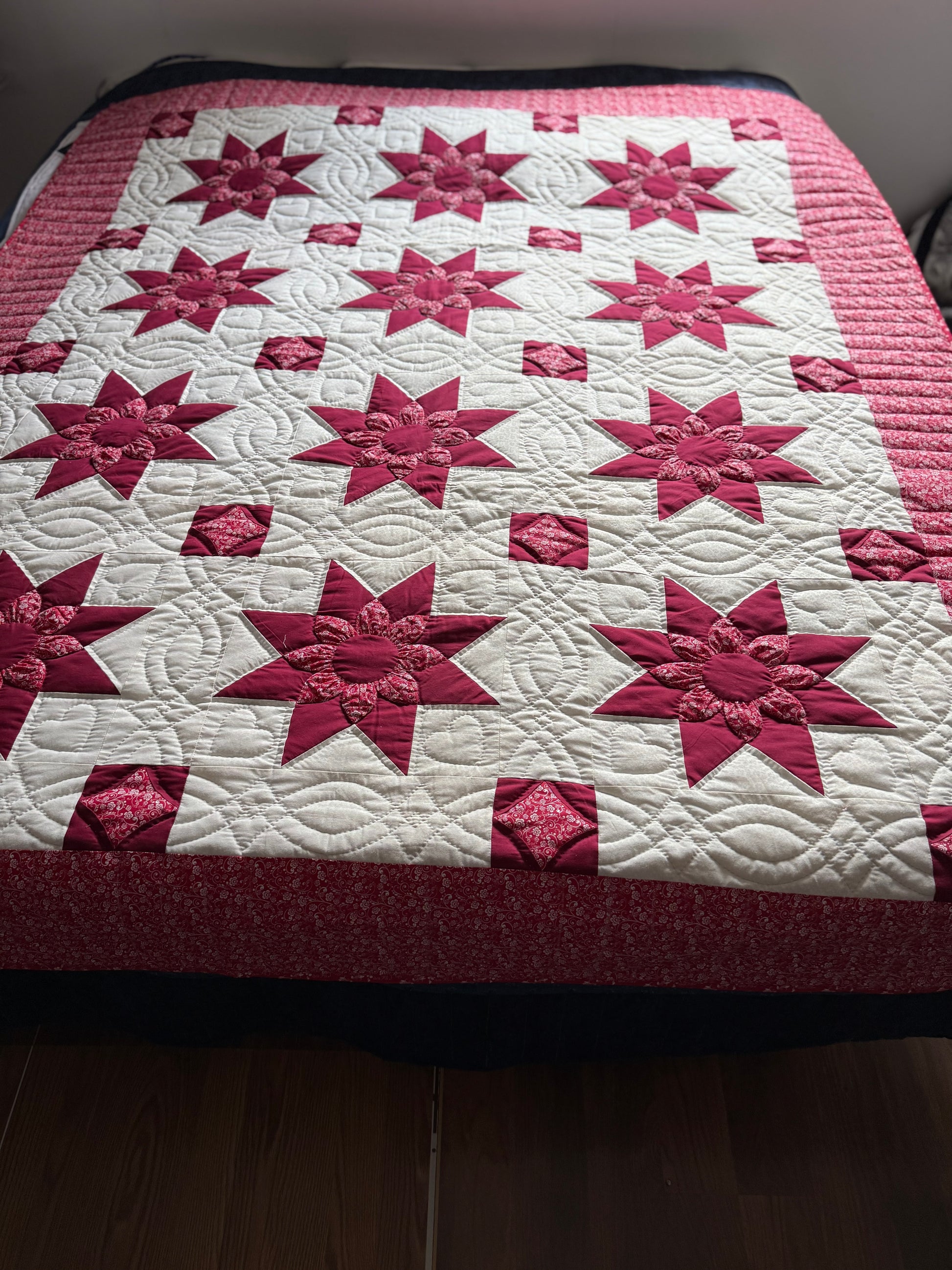 This stunning Star Dahlia quilt was lovingly handmade by our Amish friends right here in Pennsylvania. Every tiny stitch tells a story of patience, craftsmanship, and tradition passed down through generations.